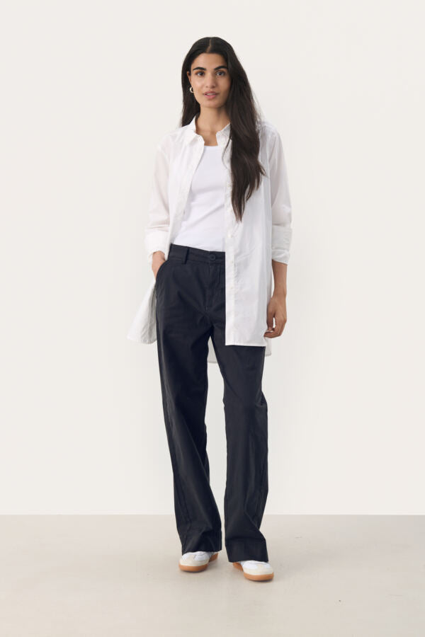 Modellen er 176 cm høj og bærer en størrelse 36. Disse bukser med vidde er lavet af en blød bomuldsblanding, der giver en afslappet men elegant pasform. Med mellemhøj talje, sidelommer og knaplukning er de perfekte til både hverdags- og kontorlooks. Style dem med en bluse eller strik for et raffineret outfit.