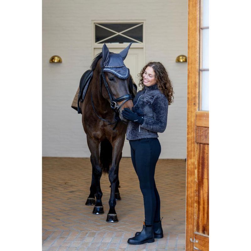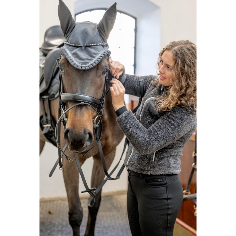 Flot udtryk med høj teknisk kvalitet og er med, tone-i-tone glitterdetaljer, der giver et flot udseende. Hutten er lavet i elastisk jersey, der sikrer god pasform omkring ørerne og komfort under ridning.