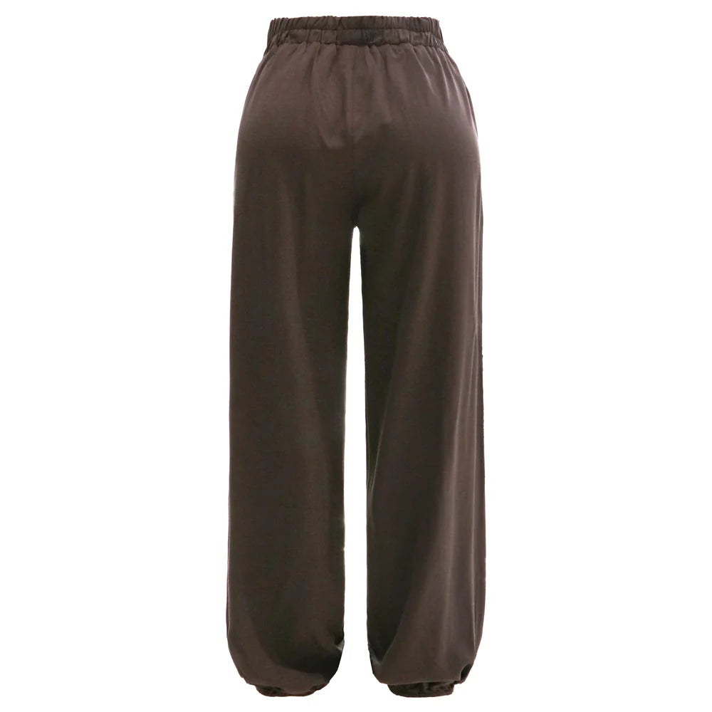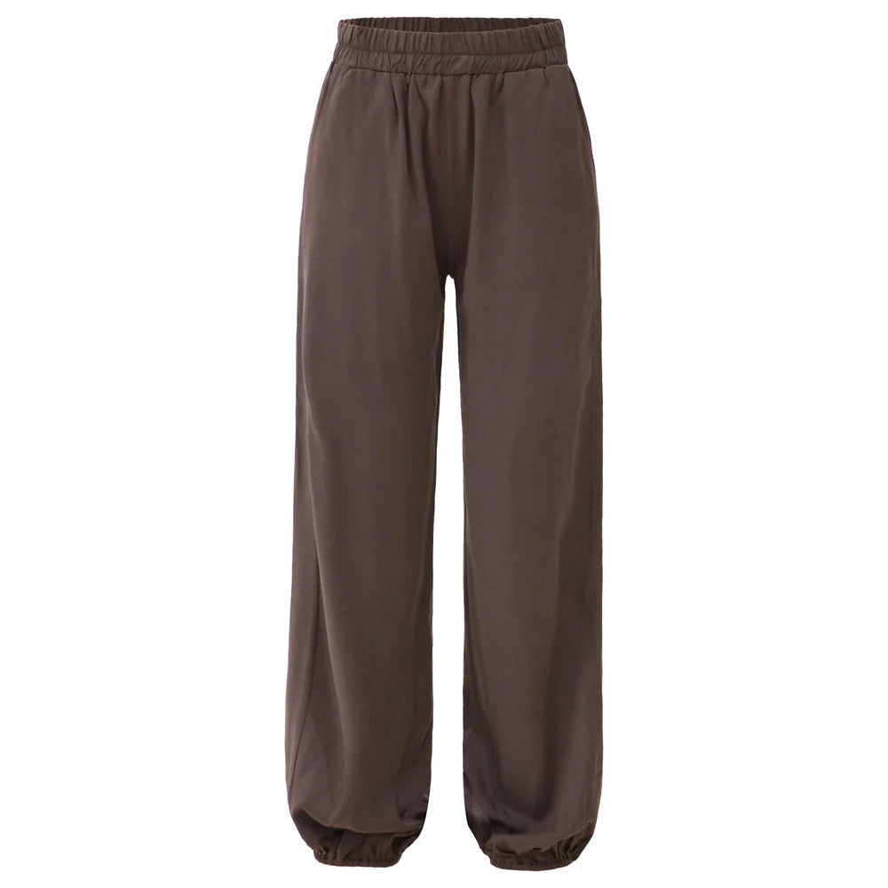 Modellen har løs pasform og elastik ved anklerne, som giver et enkelt og afslappet udtryk. Det bløde materiale gør dem velegnede til daglig brug.