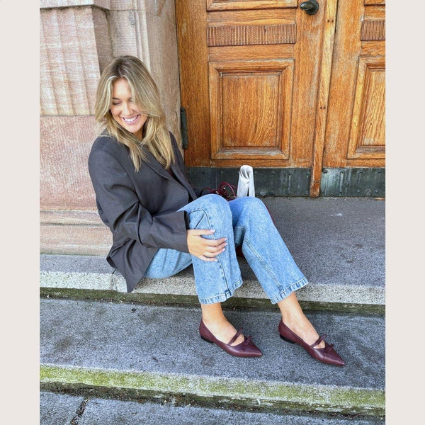 Feminin ballerina i smuk bordeaux skind med spids snude og to elegante sløjfer over vristen. Designet kombinerer klassisk charme med moderne minimalisme – perfekt til både hverdag, arbejde og festlige lejligheder.