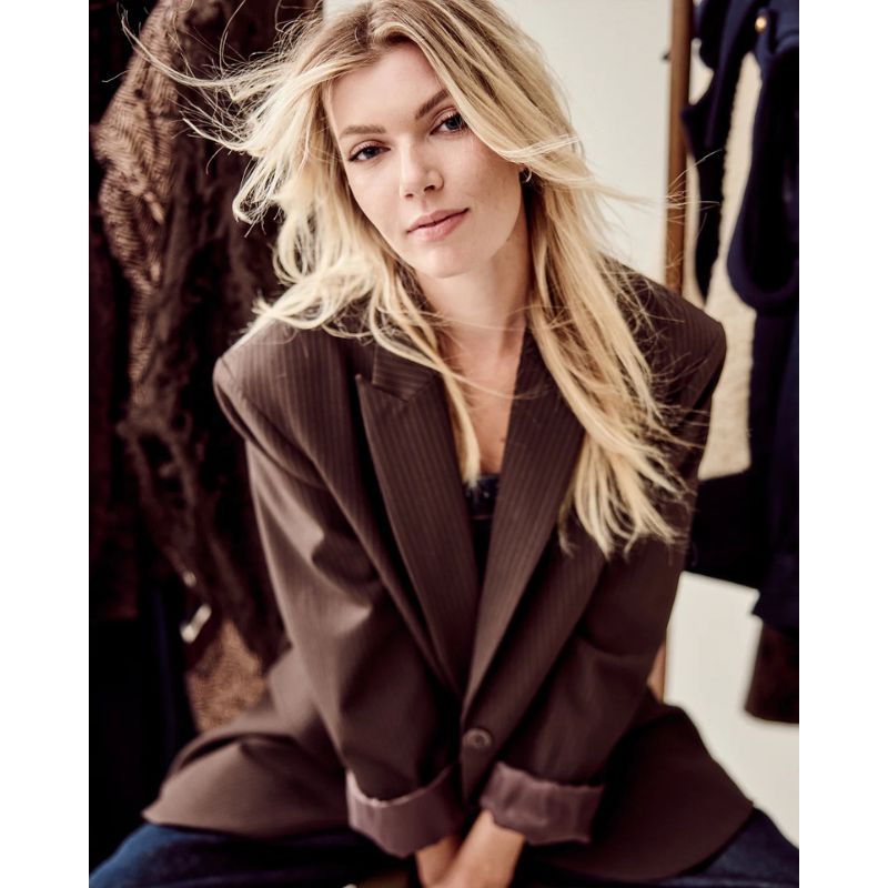 Foret blazer i mørk chokoladefarvet nålestribet stof. Elastikken bagtil gør det muligt at tilpasse taljen for en mere defineret silhuet eller vælge en løsere pasform. Blazeren har frontlommer med klap. Kan bruges som et koordineret sæt med de matchende bukser.