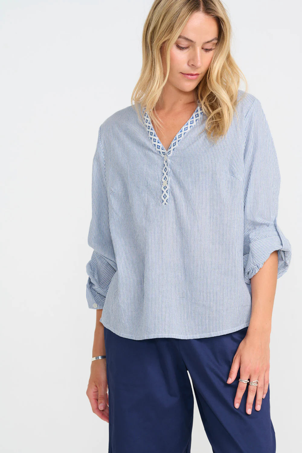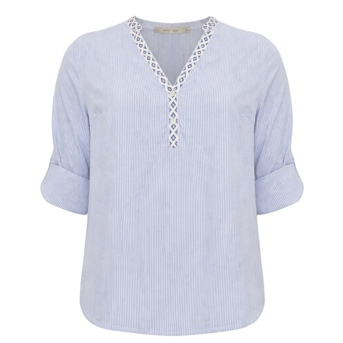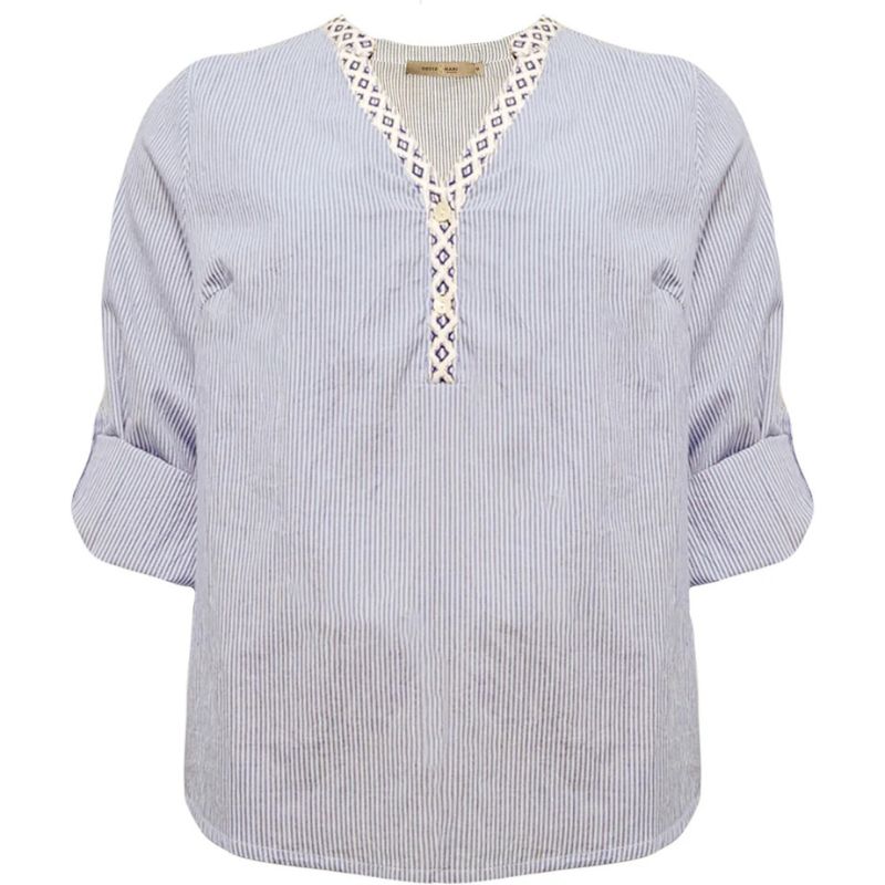 CostaMani - Skjorte Bluse - i smalstribet blå og hvid med fine detaljer ved udskæringen. Let og enkel Skjorte i 100 % bomuld.